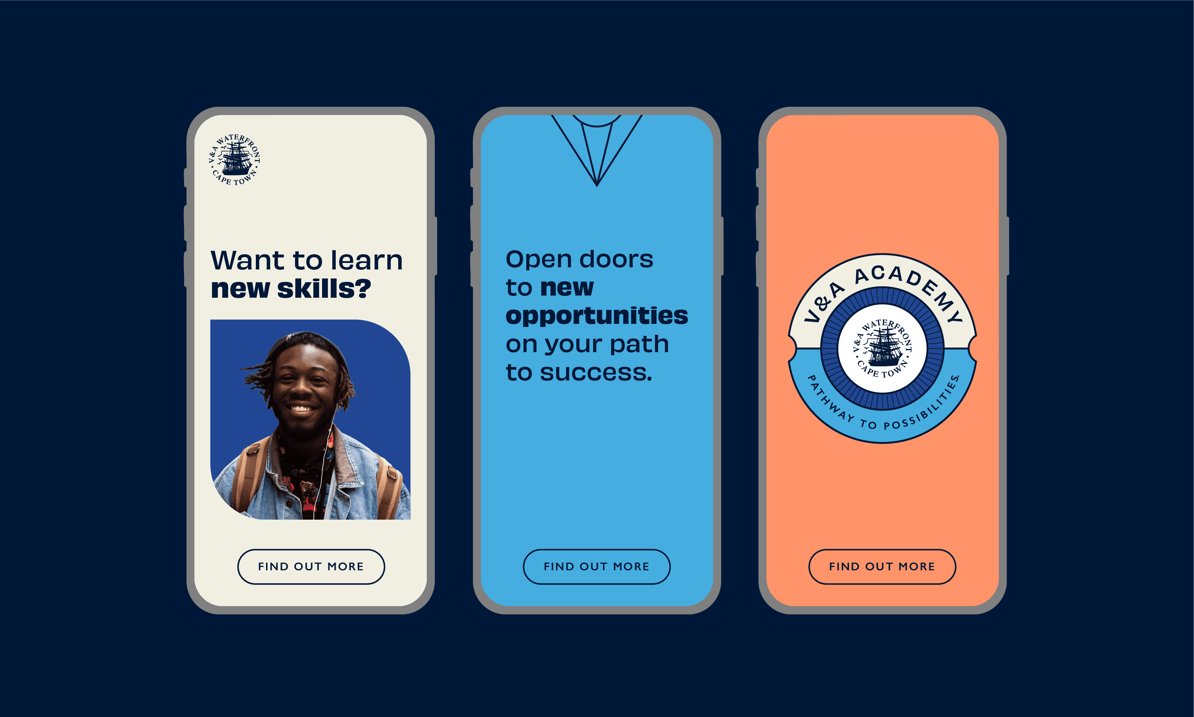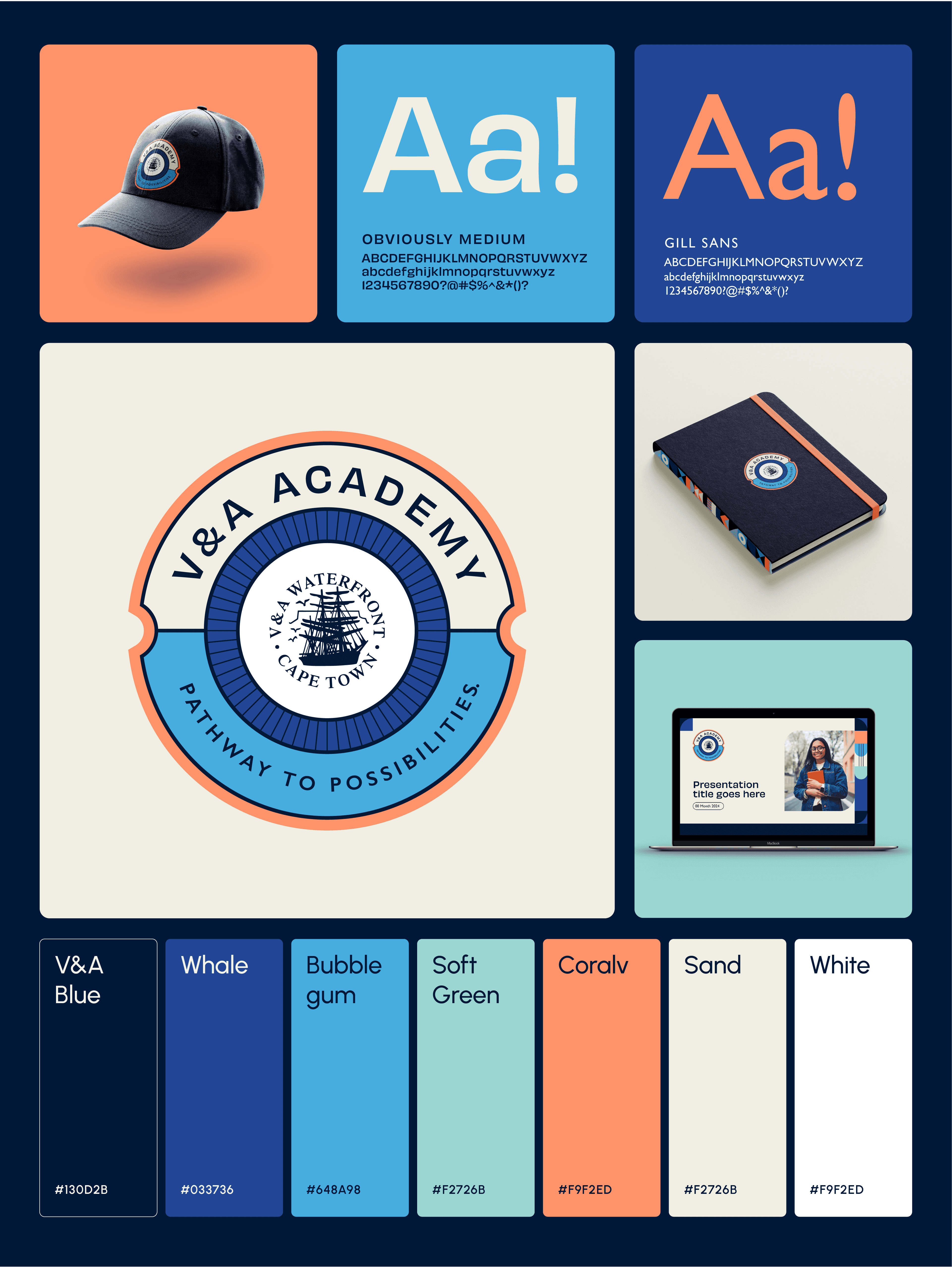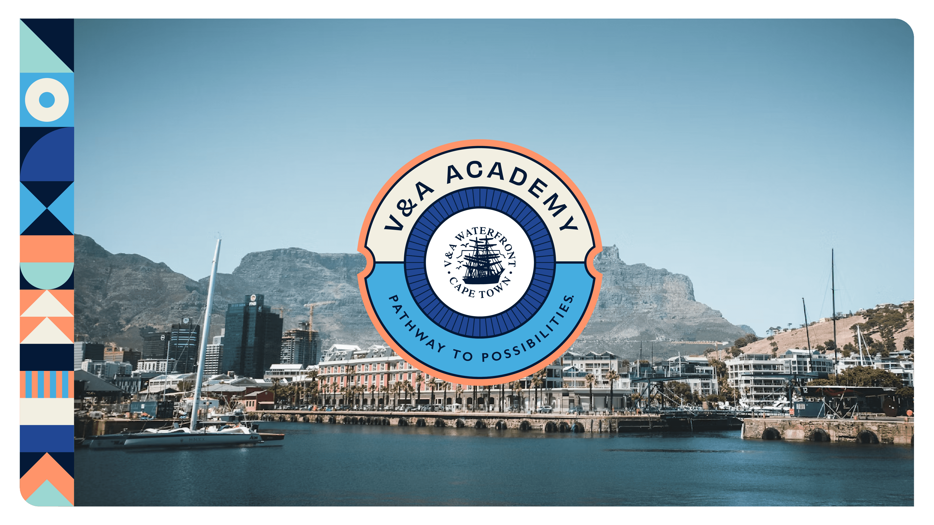 The V&A Academy is an initiative by the V&A Waterfront focused on preparing young people for careers in hospitality, tourism, and retail while addressing youth unemployment. The programme creates a pipeline of work-ready talent for businesses within the precinct and beyond. Developed while working through The Nimble Studio, the identity was designed as a sub-brand within the existing V&A Waterfront branding system. A curated selection of the Waterfront’s colour palette was used to create a distinctive yet connected visual presence. The circular emblem draws on maritime references from the Waterfront while symbolising pathways, growth, and opportunity. Combined with clean, contemporary typography, the identity communicates optimism, professionalism, and the Academy’s role in guiding young people toward meaningful employment.